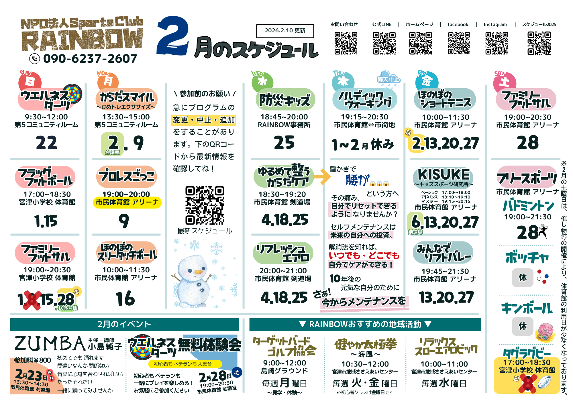 新着情報 2026.2.8new 2/8 タグラグビーとファミリーフットサルは中止します。 2026.1.29new 2/23 ZUMBAを開催します。 2026.1.29new 2月のスケジュールが完成しました! 2026.1.28new NPGの新年号が完成🎶